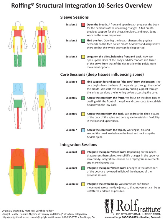 The hallmark of Rolfing® Structural Integration is a standardized “recipe” known as the Ten-Series, the goal of which is to systematically balance and optimize both the structure (shape) and function (movement) of the entire body in gravity over the course of ten Rolfing sessions. (Most people should start to see the results they are looking for within one to three sessions.)